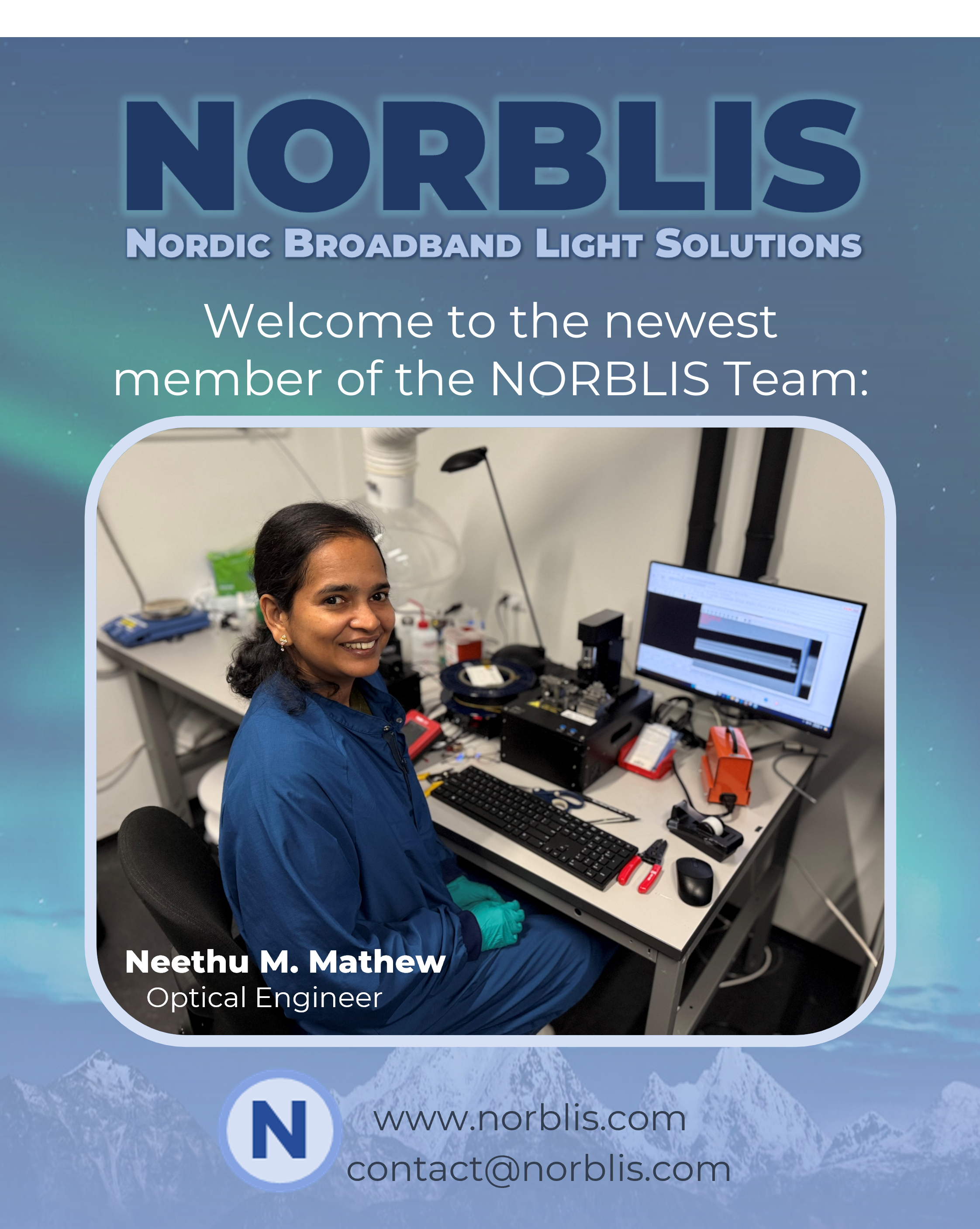 Since January 1st we have had the pleasure of welcoming Neethu Mathew to the NORBLIS team. Neethu comes from DTU Electro, Technical University of Denmark, with an MSc in Photonics, a PhD in space division multiplexing in optical fibers, and a longer postdoc period working on the development of stable fiber-based mode-multiplexers called photonic lanterns. With her unique background in optical fiber splice technology, she is ideally suited for NORBLIS, where she will join the team responsible for the development and optimization of NORBLIS mid-infrared supercontinuum lasers, ensuring the highest possible stability and reliability. Welcome Neethu!