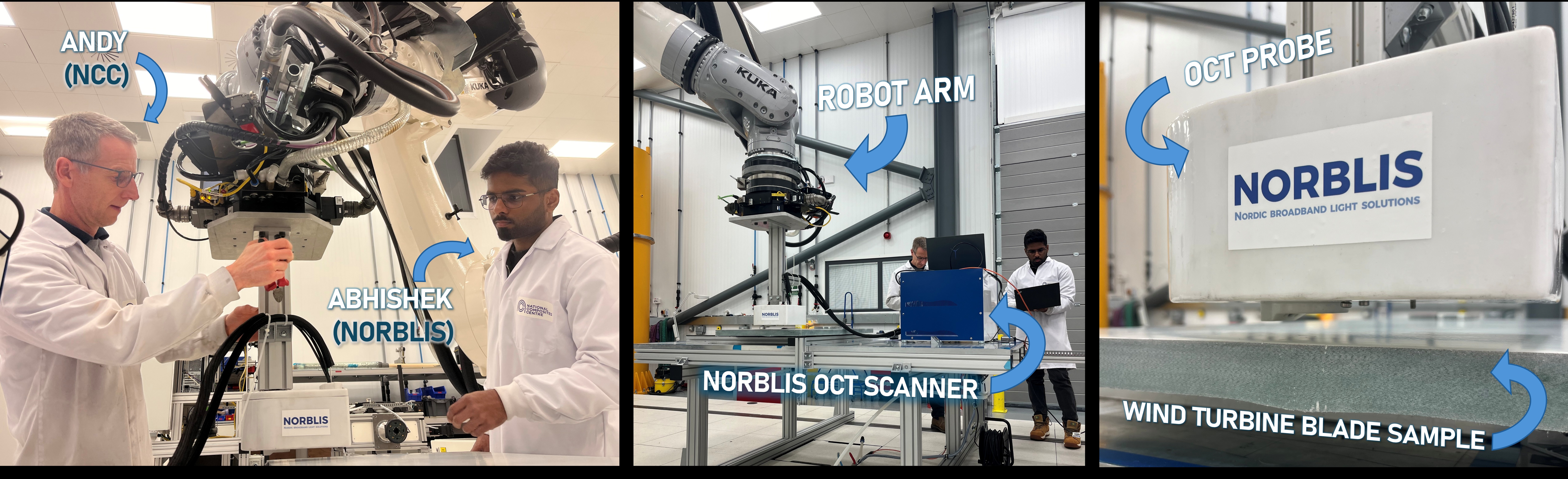 Another promising application of the NORBLIS mid-infrared OCT scanner is non-contact, non-destructive, subsurface inspection of coatings to detect defects and other irregularities, which can dramatically reduce the lifetime of the coating on for example wind turbine blades (WTBs) and ships. At the end of 2024, as part of the Horizon Europe project TURBO, NORBLIS successfully installed one of their OCT scanners on a robot arm at the National Composites Centre (NCC) in Bristol, UK. This allowed for remote scanning of larger samples, such as WTB samples from Siemens Gamesa, as shown in the pictures below. The NORBLIS OCT scanner is able to penetrate both the top-coating and the primer layers of the WTB, despite their highly scattering nature. The robot test scans represent the first ever meter-long scan made by an OCT system. The installation and robot tests mark a successful milestone in hashtag#TURBO (https://turboproject.eu) and a significant step towards full blade scanning and hashtag#sustainable, hashtag#ZeroDefectManufacturing of WTBs. For journal papers on the scanning of WTBs and marine coatings with the NORBLIS OCT scanner see doi.org/10.1002/we.2810, https://lnkd.in/dcRaxFE5 Photos left to right: NORBLIS OCT engineer Abhishek Sajeev and NCC engineer Andy Metherell install the optical fiber coupled probe head of the NORBLIS OCT scanner on the arm of the NCC robot; Abhishek and Andy operate the movement of the robot from a distance during a scan of a small section of a WTB; Close-up of the NORBLIS probe head doing a scan.