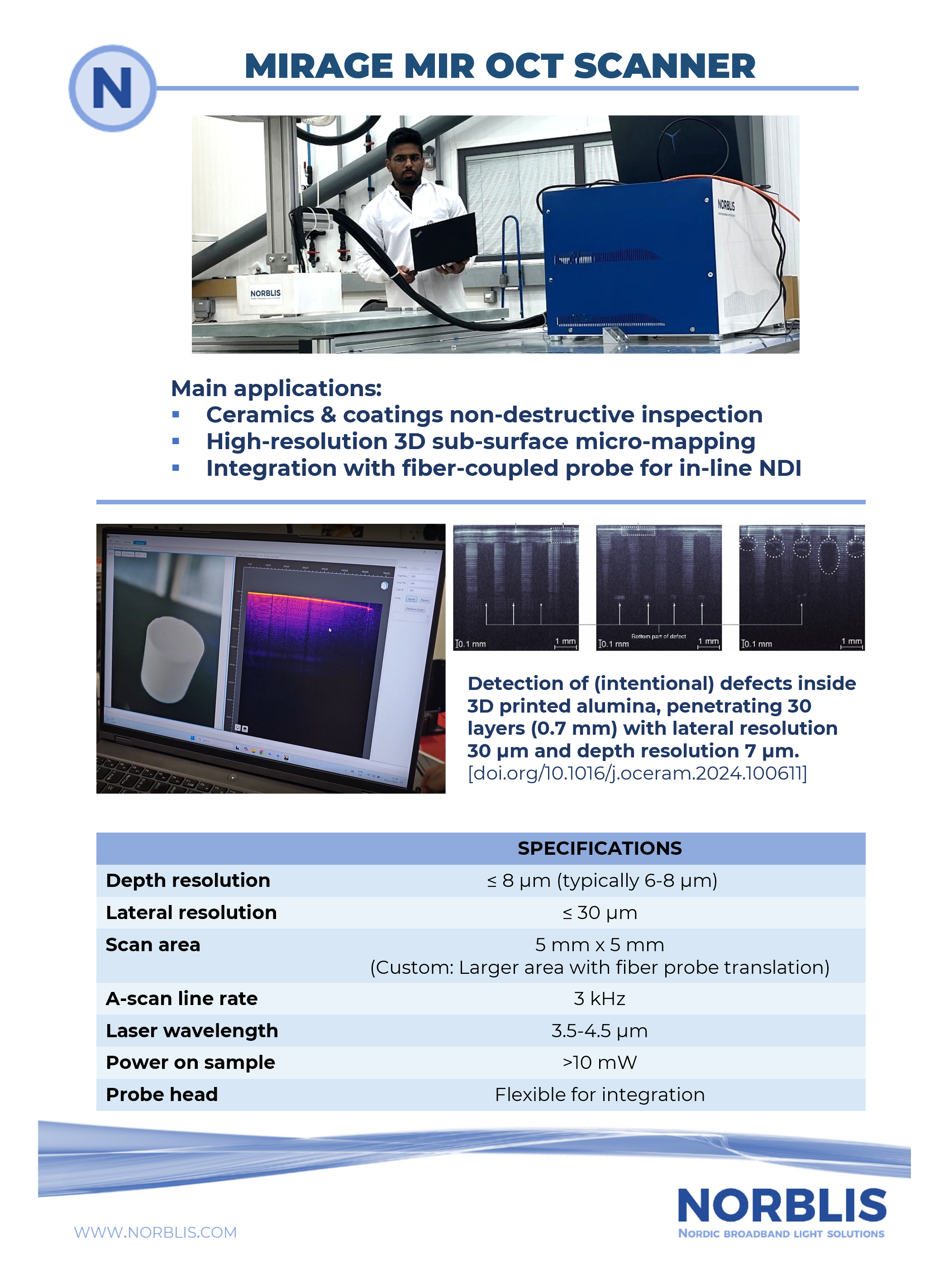 There is more to see! The Mirage ("to look at, to wonder at") Mid-IR OCT system is the first of its kind based on the NORBLIS supercontinuum laser technology, enabling fast and high-resolution sub-surface imaging in scattering media, such as:
