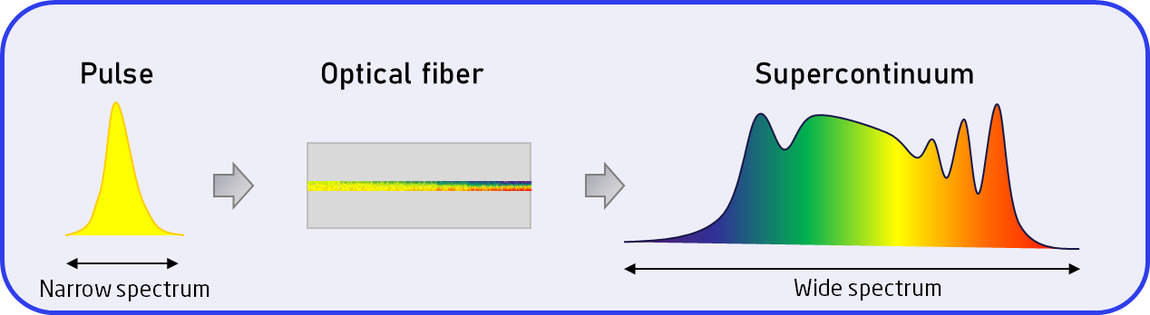 The key technology enabling applications such as optical coherence tomography (OCT) and multi-species gas spectroscopy is supercontinuum generation. The concept of supercontinuum generation is illustrated below. It involves the interaction of an intense laser pulse with a nonlinear medium, such as an optical fiber, resulting in the generation of new colors/wavelengths.